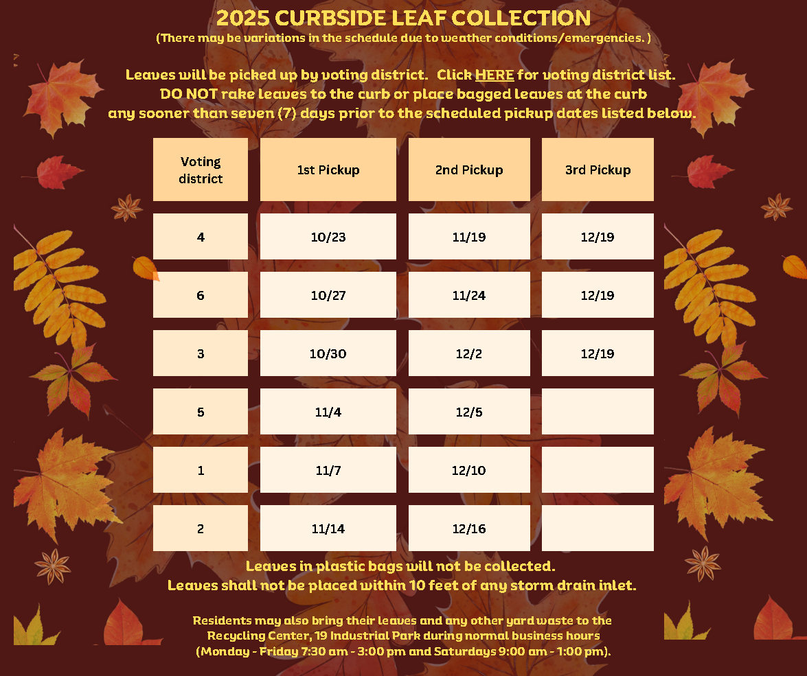 - Residents can leaves to the Recycling Center during normal business hours (Monday through Friday 7:30 am - 3:00 pm; Saturdays 9:00 am - 1:00 pm).