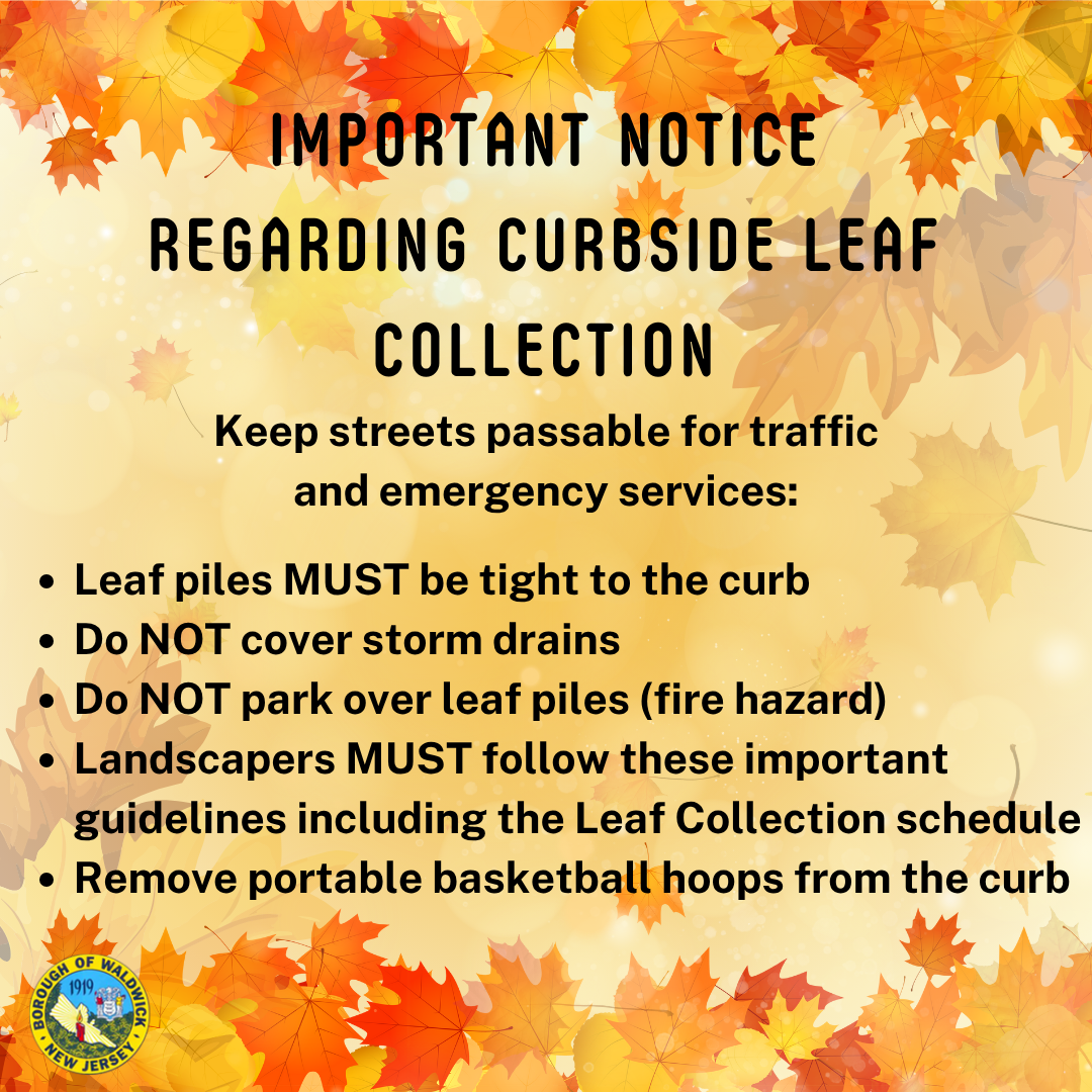 Prior to fall leaf collection, the Borough provides weekly yard waste collection from April 14 through October 16. Please see www.waldwicknj.gov/yardwaste for more information.