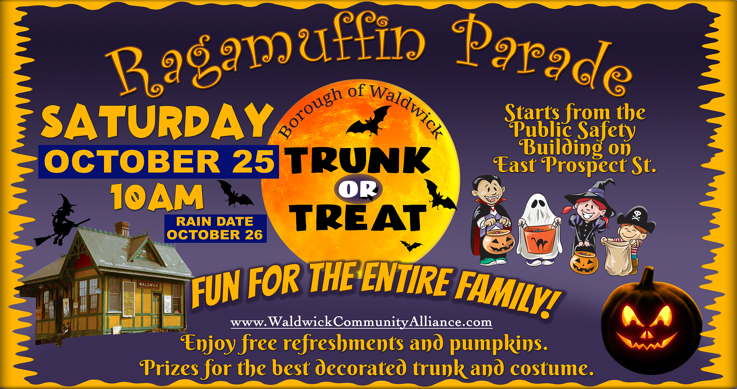 Fun for the entire family! This event will take place on Saturday, October 25, 2025, at 10:00 am (10/26 Rain date). Enjoy free refreshments and pumpkins. Prizes for the best decorated trunk and costume. The Parade starts from the Public Safety Building to East Prospect Street. For more information visit www.WaldwickCommnityAlliance.com
