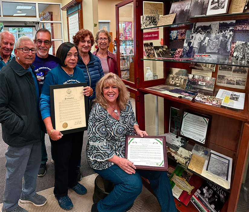 Members of the Italian American Social Club of Waldwick celebrate a century of its community organizations with historic artifacts at the Waldwick Library’s exhibit space. A Bergen County Proclamation given by James Tedesco and a Certificate of Recognition by Mayor Tom Giordano are also placed on display during National Italian American Heritage month of October.
