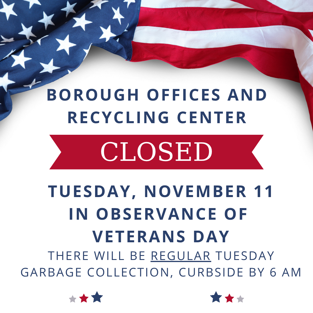 Borough offices and the Recycling Center will be CLOSED on Tuesday, November 11 in observance of Veterans Day. There will be REGULAR Tuesday Garbage Collection, Curbside by 6 AM