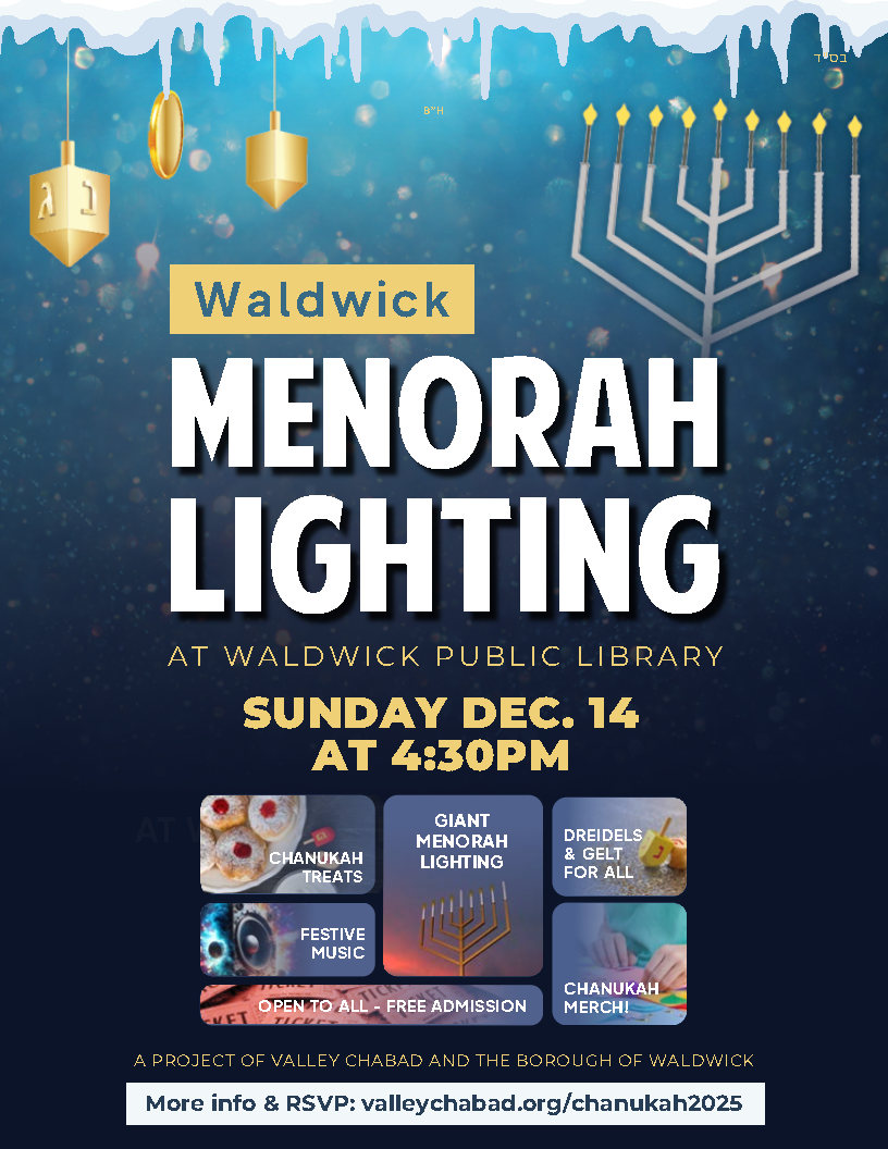 Join us and Valley Chabad at the Waldwick Public Library located at 19 East Prospect Street on Sunday, December 14 at 4:30 pm for our Annual Menorah Lighting. This event is open to all. Come enjoy Chanukah treats, fun games and festive music!