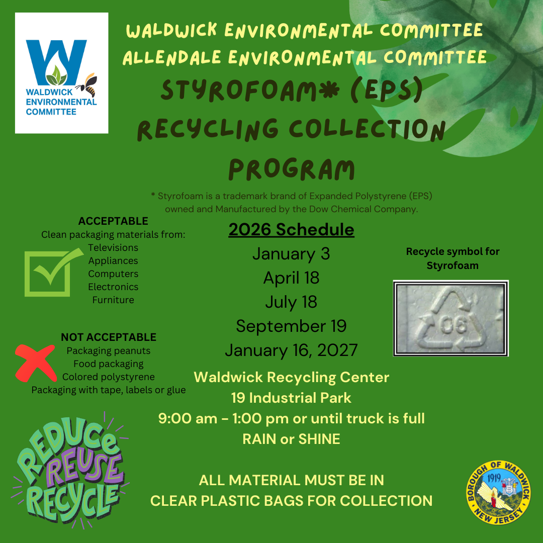 All Styrofoam Collection events will take place rain or shine at the Waldwick Recycling Center, located at 19 Industrial Park, from 9:00am-1:00pm OR until truck is full.