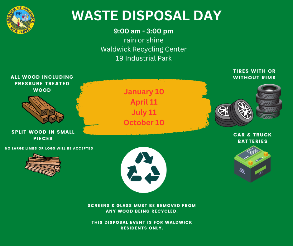Waste Disposal Day on Saturday, January 10, 9:00 am - 3:00 pm, rain or shine at the Waldwick Recycling Center, 19 Industrial Park. All wood including pressure treated, split wood in small pieces, tires with or without rims and car & truck batteries. These events are for Waldwick residents only.