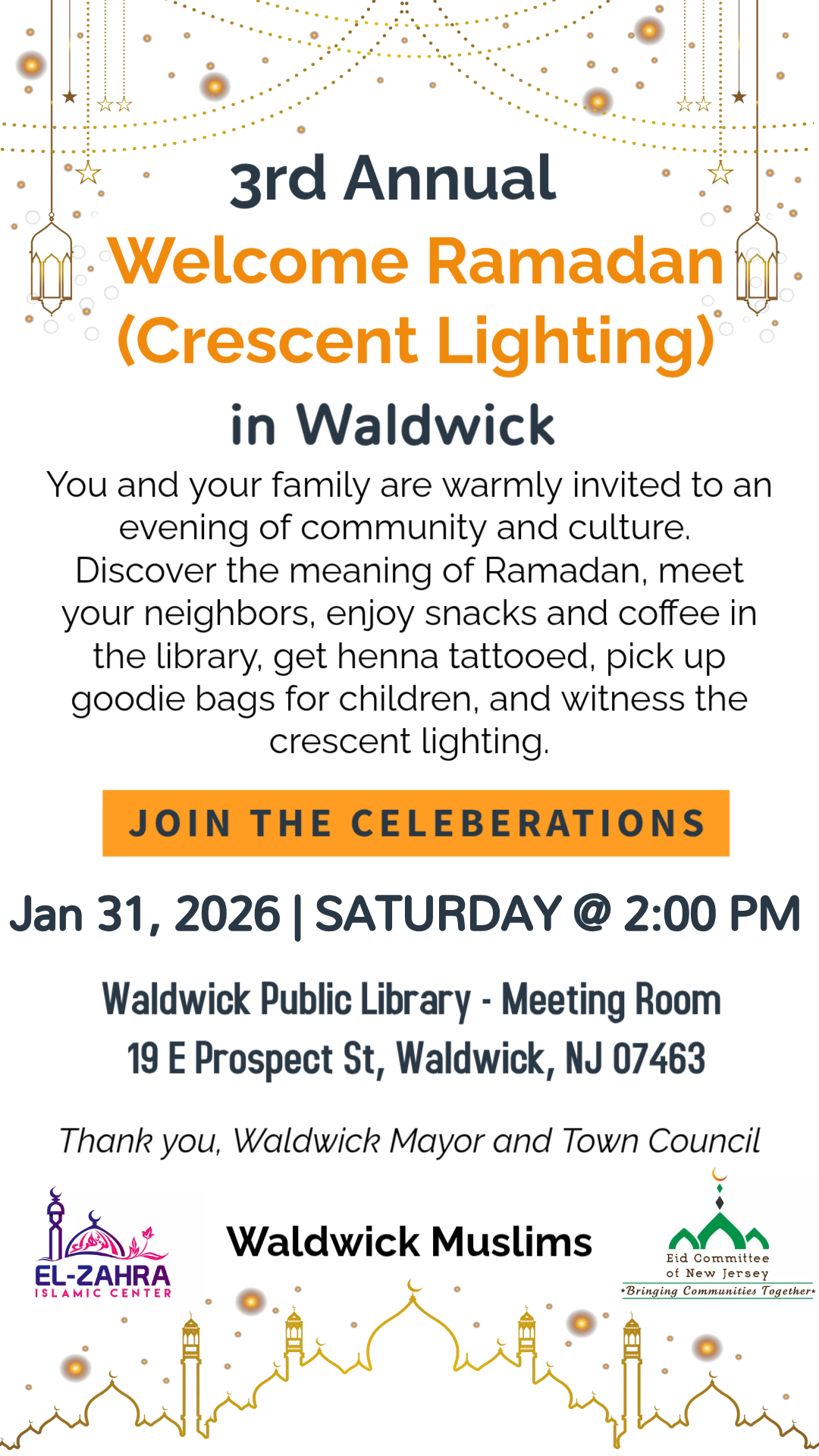 You are warmly invited to an evening of community and culture. Discover the meaning of Ramadan, meet your neighbors, enjoy snacks and coffee in the library, get henna tattooed, pick up goodie bags for children and witness the crescent lighting. This event will be held on Saturday, January 31 at 2:00pm at the Waldwick Public Library.