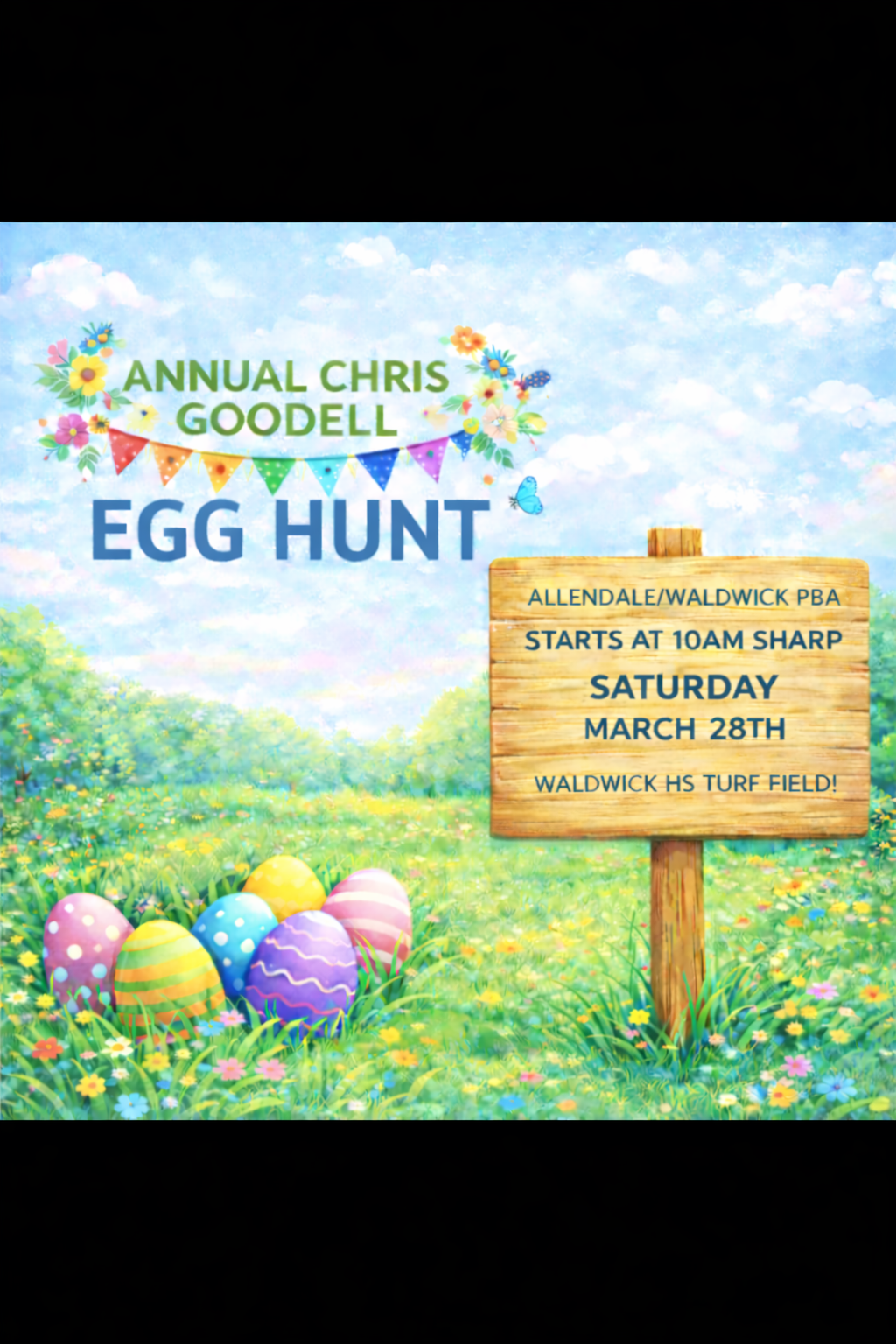 Waldwick/Allendale PBA presents its Annual Christopher Goodell Egg Hunt. This event takes place on Saturday, March 28 at 10:00 AM SHARP! Rain date: Saturday, April 4