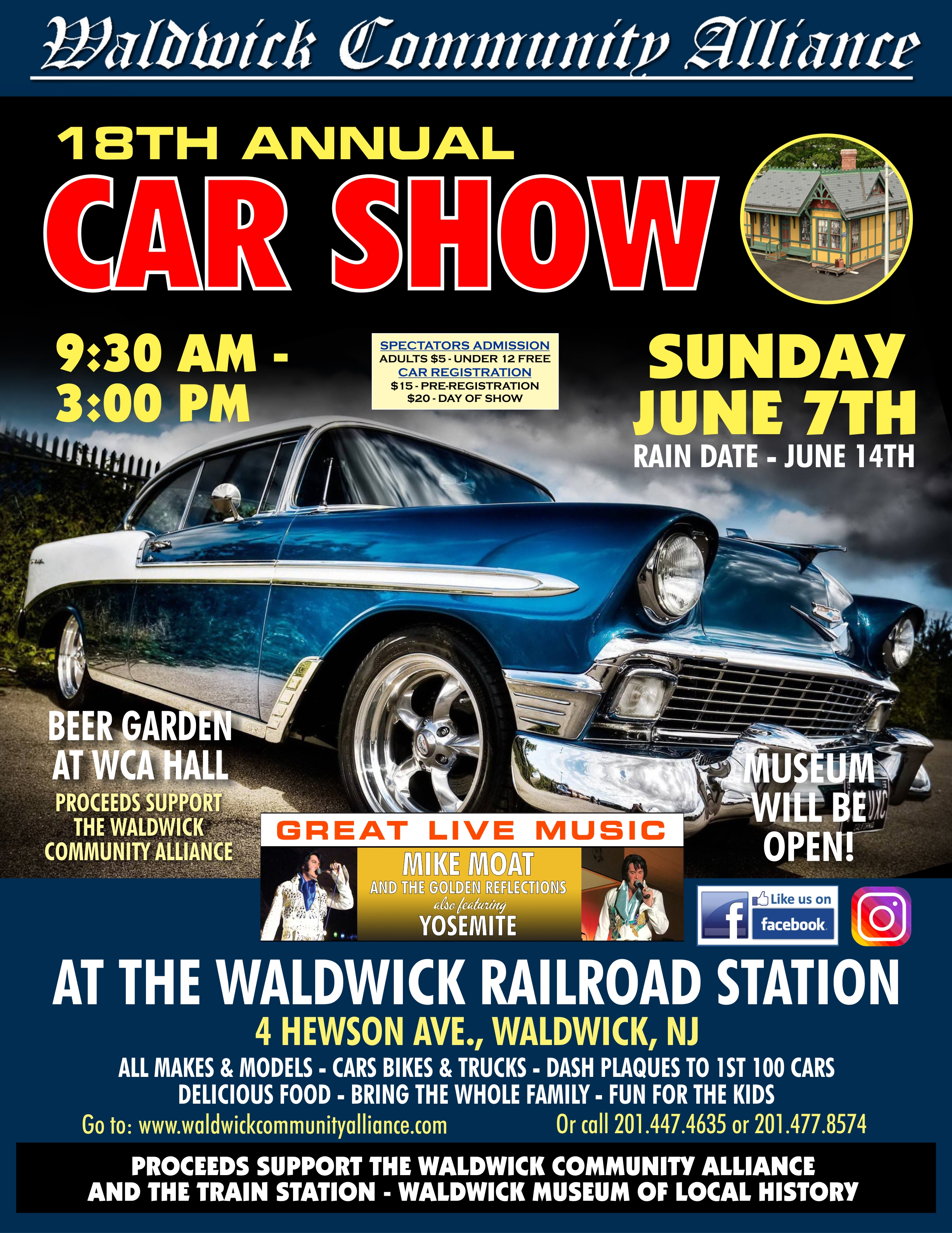 All makes & models welcome β cars, bikes, and trucks! The first 100 cars will receive dash plaques. Enjoy delicious food, live music by Mike Moat & The Golden Reflections featuring Yosemite, a Beer Garden at WCA Hall, and the Waldwick Museum of Local History will be open during the event.