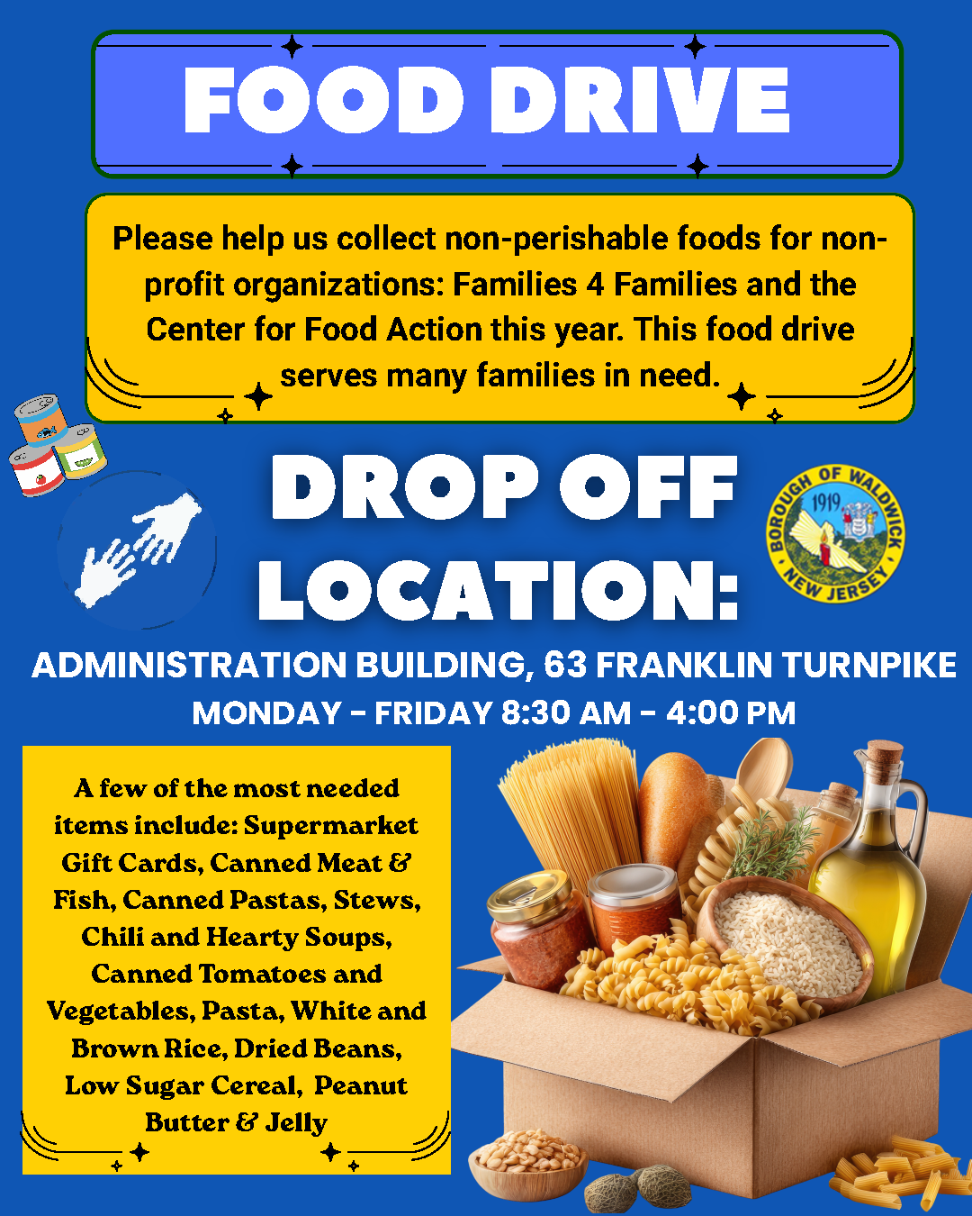 Please help us collect non-perishable foods for non-profit organizations: Families for Families and Center for Food Action this year. With your help, this food drive will help many families in need!