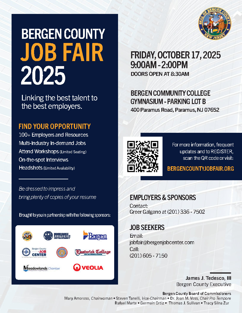 This event is to take place on Friday, October 17, 2025, from 9:00 am - 2:00 pm location at the Bergen County Community College Gymnasium. Parking is available in Lot B. Linking the best talent to the best employees! FIND YOUR OPPORTUNITY! Be dressed to impress and bring plenty of copies of your resume. For more information visit: bergencountyjobfair.org