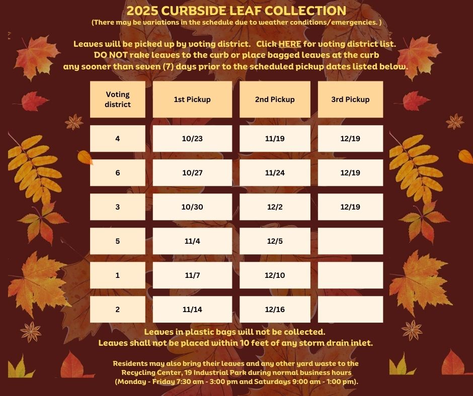CLICK HERE for the full-size 2025 Curbside Leaf Collection flyer. Leaves will be picked up by voting district. DO NOT rake leaves to the curb or place bagged leaves at the curb any soon than seven (7) days prior to the scheduled pick-up dates. Leaves in plastic bags will not be collected. Leaves shall not be placed within 10 feet of any storm drain inlet. There may be variations in the schedule due to weather conditions or emergencies. Residents MAY also bring their leaves and any other yard waste to the Recycling Center, 19 Industrial Park, during normal business hours (Monday-Friday 7:30 am - 3:00 pm and Saturdays 9:00 am - 1:00 pm)